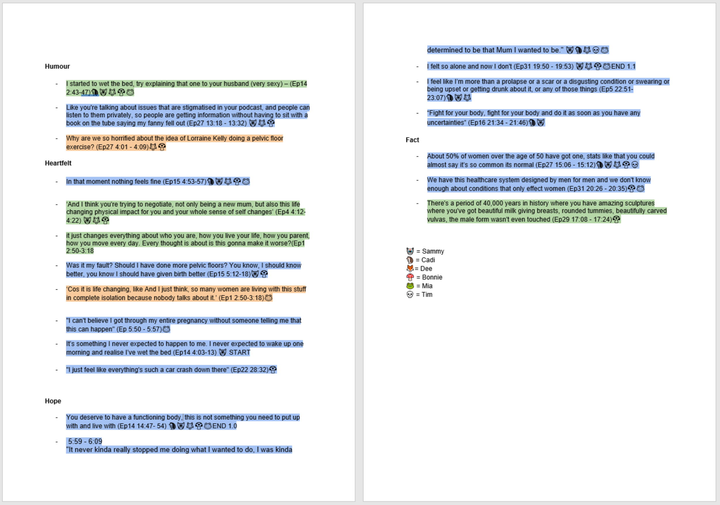 Bonnie Harris So we actually delegated, I think it was about five each? It ended up being about five podcasts each, podcast episodes each, to each person. And we all went away over the weekend and listened to five episodes of the podcast. And then whilst listening to it jotted down timestamps of quotes that we thought were really useful. And then in a meeting, we basically shared all of those timestamps and be like, this is what's said. And then it took us quite a while to like, like, we had the first draft of "Okay, this is what we need. How long is it?” “It's five minutes.” “Okay. Which ones do we want to get rid of? Oh, but these are also good." Yeah. And yeah, it took about a week of us just be like, “No, we have to get rid of this clip.” “I know, it's really good.” “But we have to get rid of this audio clip and just doesn't, you know, this one basically says it there.” And yeah, we listen to every single podcast episode, basically. Yeah.